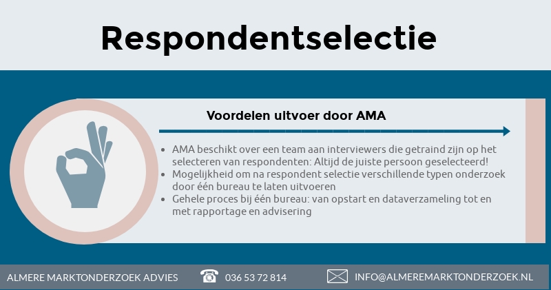 AMA kan zowel alleen de selectie uitvoeren (klant doet vervolgonderzoek zelf) als ook het vervolgonderzoek. De medewerkers van AMA zijn getraind in onderzoek dus snappen des te meer het belang van de juiste kandidaat. Daarom kunnen wij zeggen dat respondentselectie een van onze specialismen is. De doorlooptijd van het selecteren van kandidaten is afhankelijk van de doelgroep en het onderwerp. Nadat de personen zijn geselecteerd voor een onderzoek krijgen zij van ons direct een bevestigingsbrief mee, ook wordt de bevestigingsbrief per email toegezonden. Daarnaast worden alle kandidaten voorafgaand aan het onderzoek nogmaals door ons benaderd (meestal per telefoon) om hen te herinneren aan hun deelname. Tevens zoeken wij altijd reservekandidaten die ingezet kunnen worden in geval van afmeldingen.
